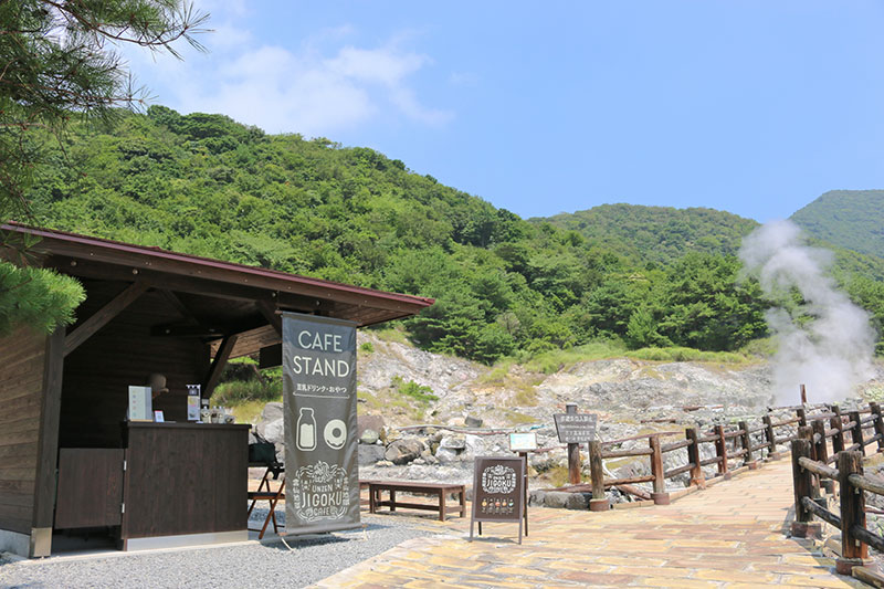 噴気や温泉熱、酸性水の影響で白くなった粘土状の温泉余土におおわれた雲仙地獄地帯。至る所から蒸気が激しく噴出し、硫黄の匂いと湯けむりの中は、恐ろしげな地獄の景色そのもの。そんな雲仙地獄に2020年6月6日、新たなカフェスタンドがオープン。温泉神社横の遊歩道を地獄の方へ進んだ場所にあります。
