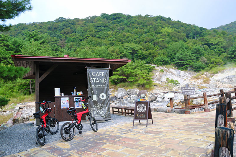 電動アシスト自転車をカフェに預けて地獄めぐりをすることが可能です。