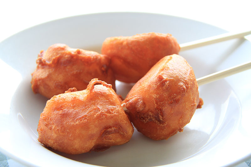 外はカリッと、中はホクホクが美味しい!名物じゃがちゃん。島原半島で採れたジャガイモを丸ごと蒸して、秘伝の衣であげていきます。シンプルなのに、また食べたくなるじゃがちゃんは、目の前であげられるのでいつでもアツアツを食べることができますよ。