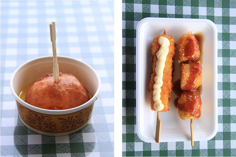 「2個食べきれない!」という方にオススメのじゃがちゃん塩バターは、女性にも大人気。/(左)じゃがいもとかまぼこを合わせたじゃがボコはマヨネーズとともにいただきます。(右)じゃがいもを蒸してカツ用の衣をつけてサクサクのソース味が美味しいじゃがカツ。