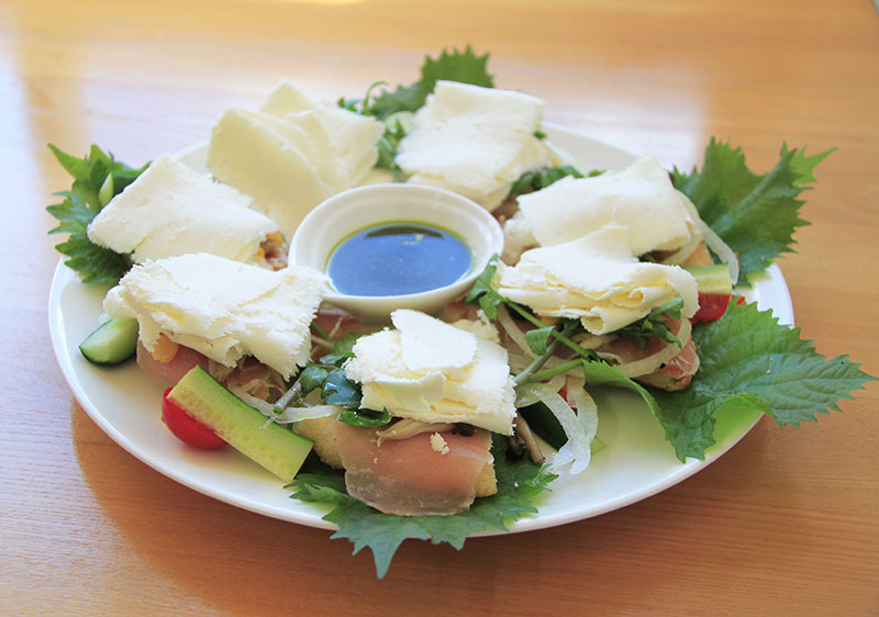 サラダのような新感覚のピザ。焼き上げたピザ生地の上に、生ハム、旬のフレッシュな野菜がたっぷり。チーズを目の前で削ってもらい、お好みでバジルソースをかけていただきます。