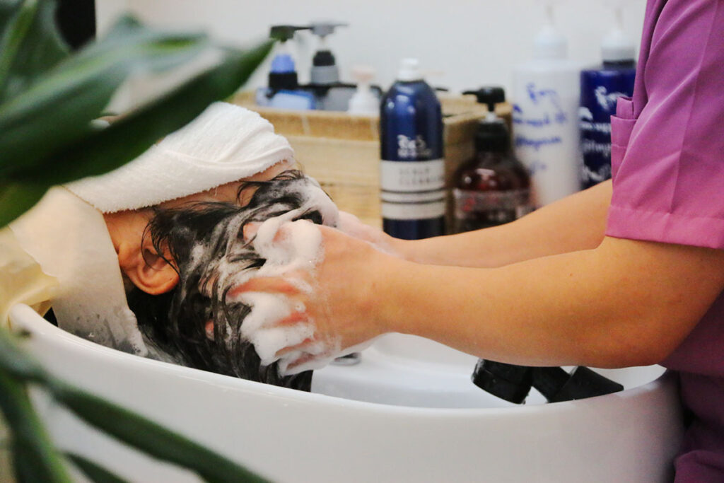 お客様にリラックスしていただけるよう、座ったままでも前方向にスイングするスツールを使用しています。腰への負担も少なくヘッドスパに集中できるため、髪も心もリフレッシュできる至福の時間をお届けします。