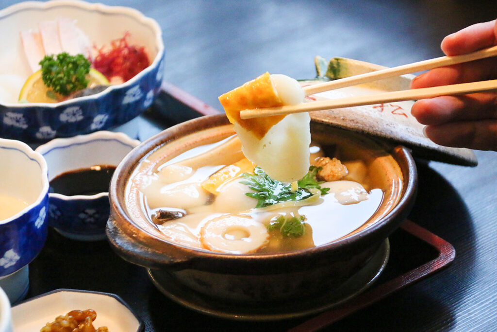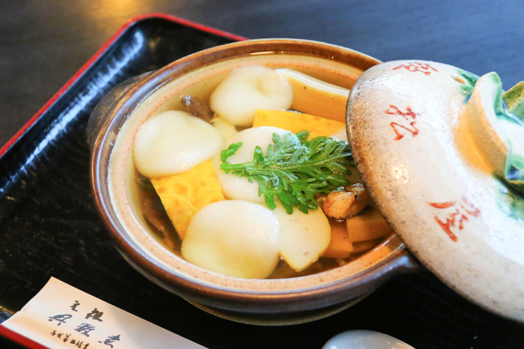 看板料理の「具雑煮」は、島原の冬のごちそう。つきたての丸餅が5個、白菜やゴボウ、レンコン、シイタケ、春菊、凍り豆腐、鶏肉、焼きアナゴ、3種類のかまぼこ、薄焼き卵…全部で13種類もの具材が土鍋の中で静かに煮えています。熱々の土鍋を開けた瞬間、湯気とともに広がるのは、かつお出汁と具材のやさしい旨み。そこに、店オリジナルの醤油がそっとアクセントを添え、シンプルながらも深い味わいを生み出します。