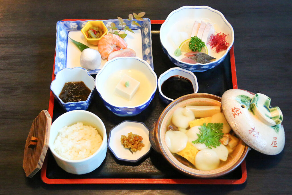 観光で歩き疲れたときのひと休みにもぴったり。郷土料理とともに味わえるかんざらしは、なめらかでもちもちの白玉と、やさしい甘さの蜜が魅力です。