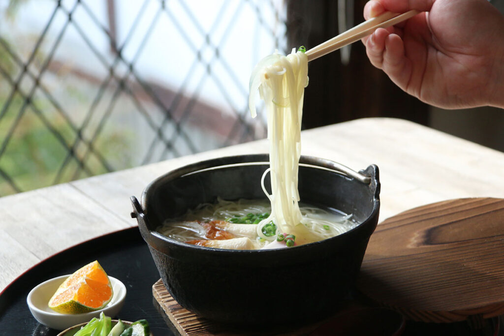 昆布だしのやさしい香りと、透き通る細麺のなめらかな喉ごし。あつあつのスープをすすれば、体の奥からほっと温まります。鍋からは湯気が立ちのぼり、見た目のインパクトと、ほっとする味わいを同時に楽しめる一杯。