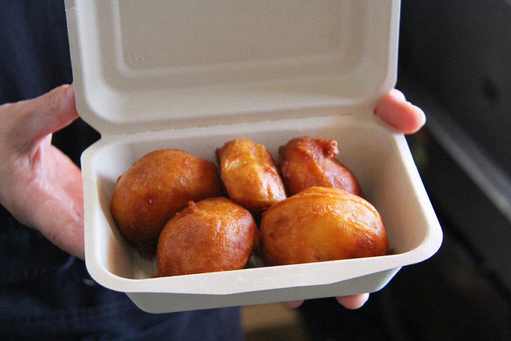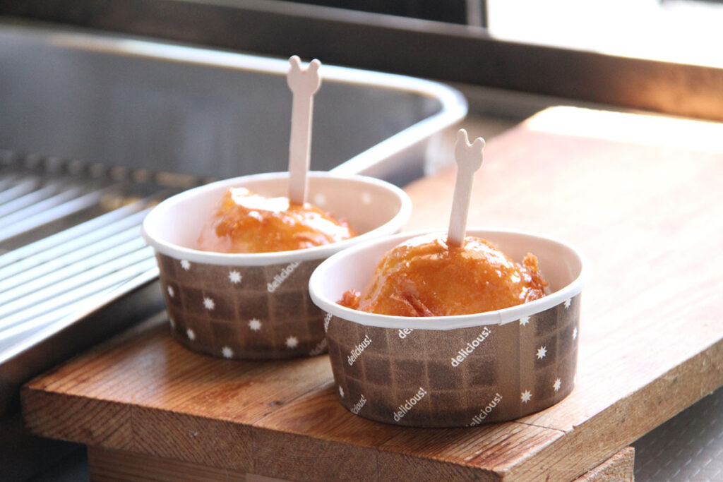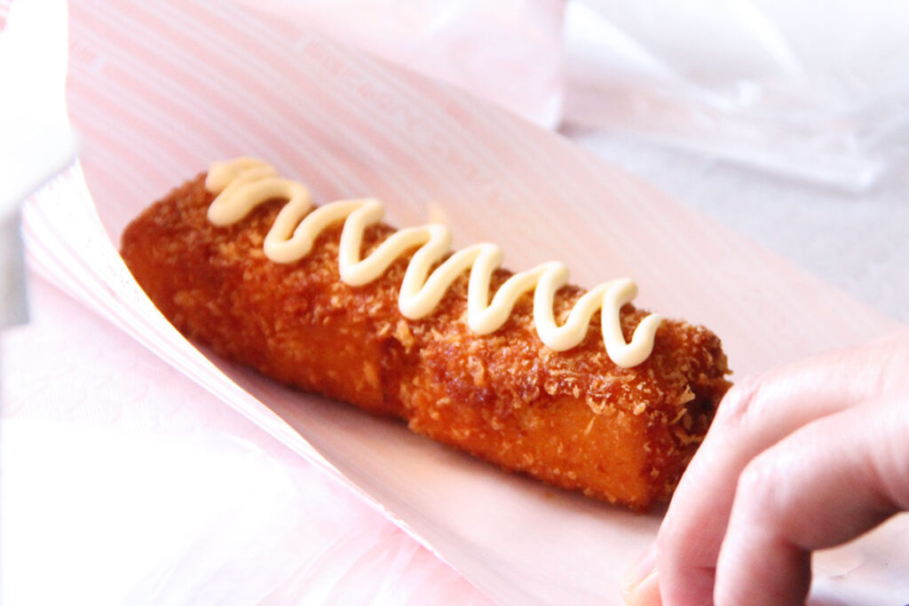 新鮮なじゃがいもを蒸し、秘伝の衣をまとわせてカラッと揚げたのが「じゃがちゃん」。ヘビーユーザーのおすすめは、野菜とハムを「じゃがちゃん」でサンドして食べること。絶妙な組み合わせで、さらにおいしさが広がるそうですよ♪