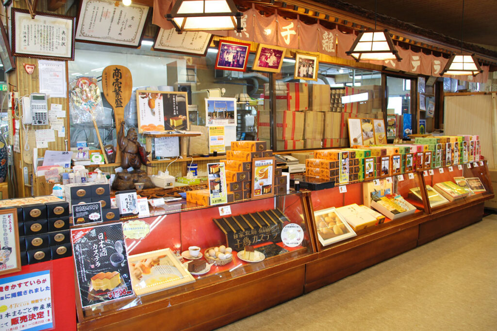 千々石観光センターでは、自家養鶏牧場の新鮮な卵で作る長崎カステラは、黄身のコクや風味が強くしっとり感と弾力がある食感に仕上がるのも特徴です。定番のカステラに加え、蜂蜜カステラ(限定五三焼き)、抹茶、カフェ、チーズ、チョコ、ろくべえ、ざぼんなど、多彩なフレーバーを用意。
