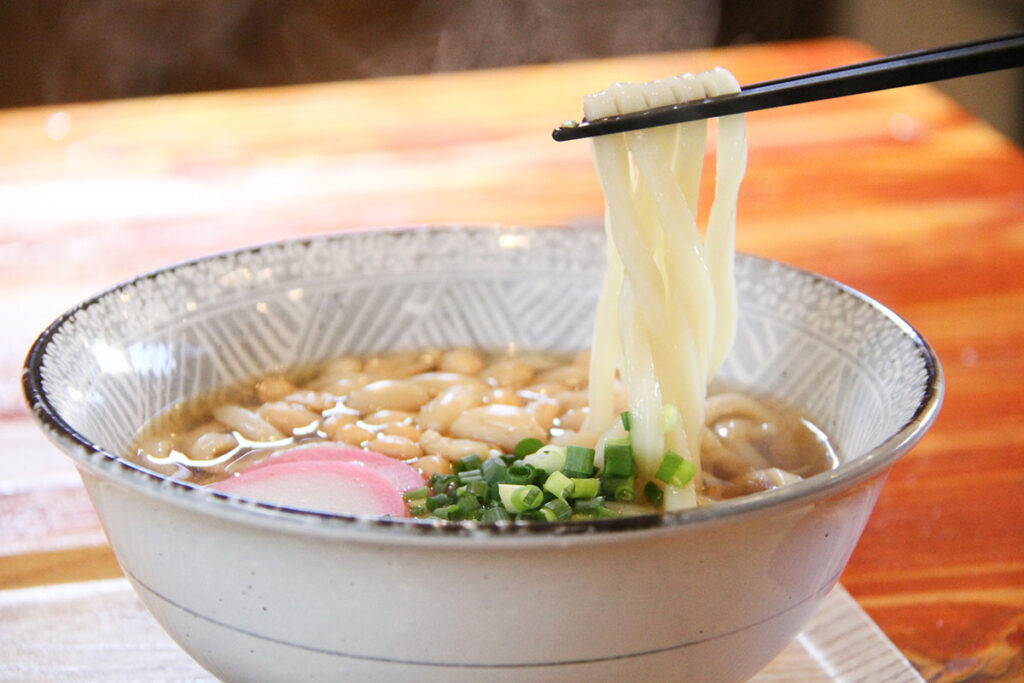 おうちカフェマロンでは、生のピーナッツと大豆を前日から水に浸して柔らかくし、一粒ずつ丁寧に皮を剥くという手間を惜しまず仕込んでいます。ピーナッツと大豆から取っただしは、まろやかでコク深く、もちもちのうどんと絶妙に絡み合います。