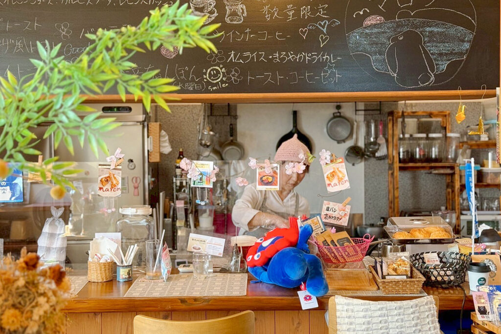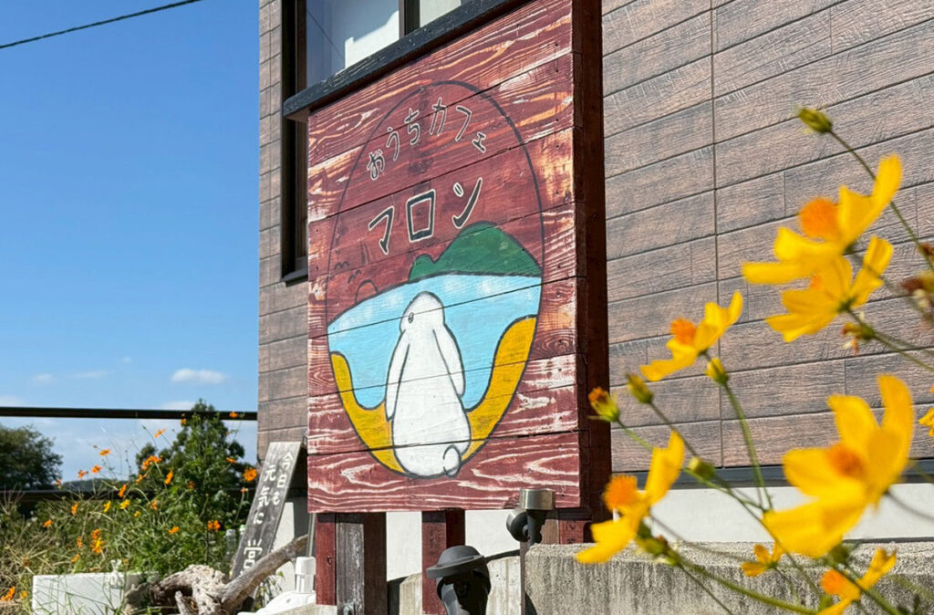 橘湾を一望できる小浜温泉外の高台に、そっと佇むカフェ。 ロゴには、橘湾に沈む夕陽を眺める「うさぎのマロンくん」。その穏やかな姿の通り、訪れる人にリラックスした時間を届けてくれる癒やしのカフェです。