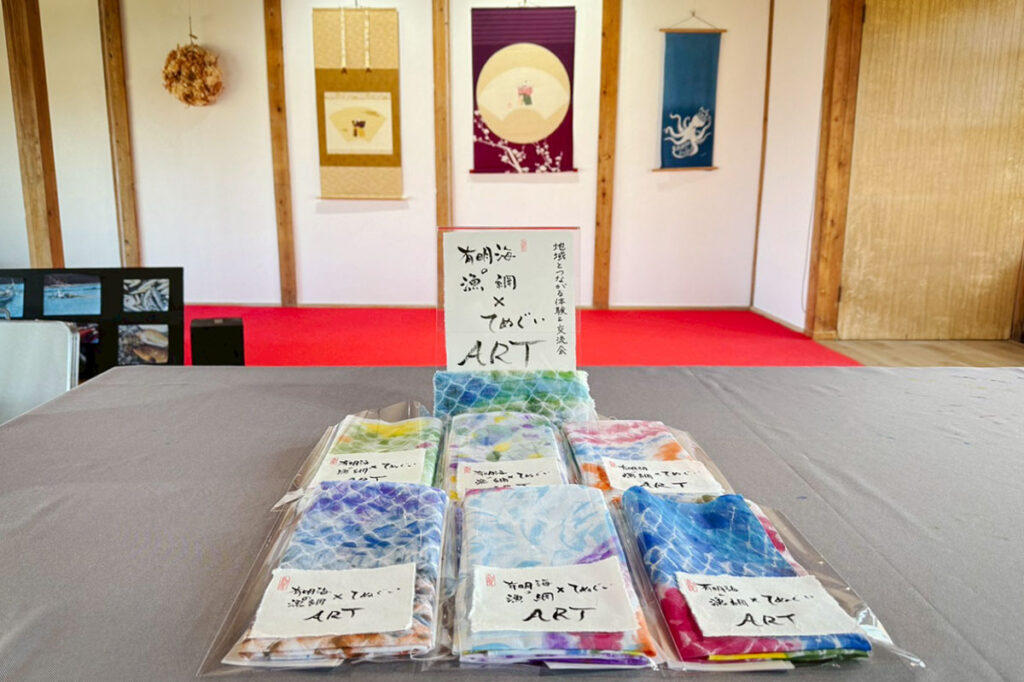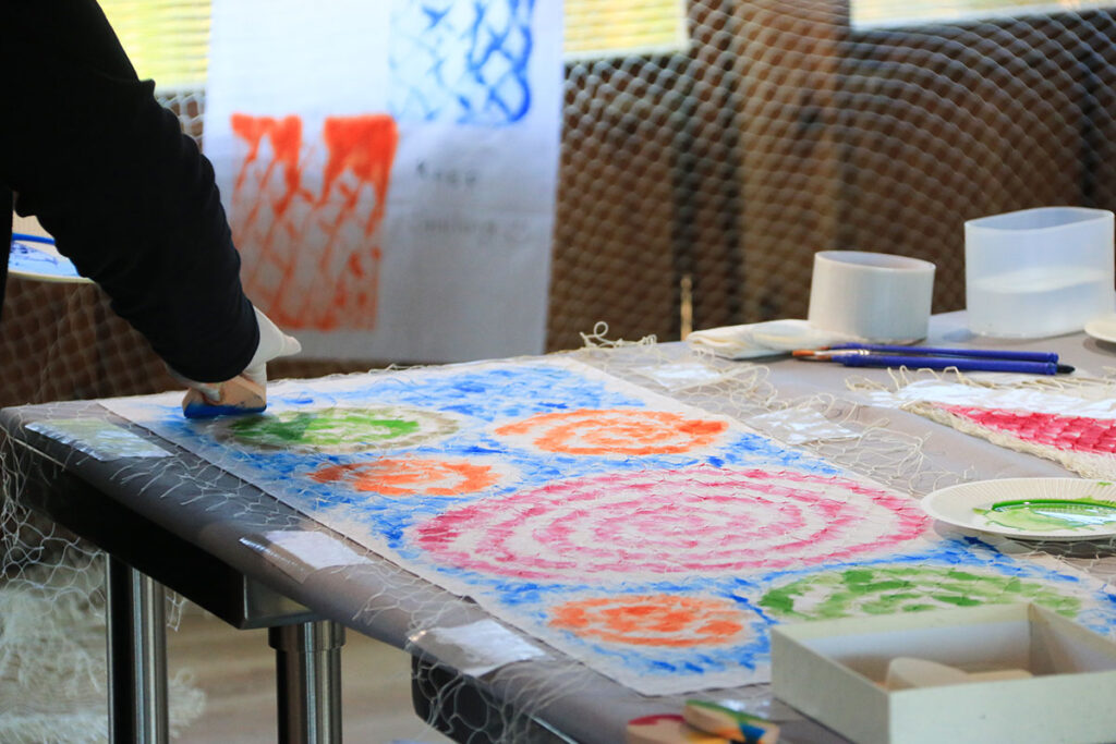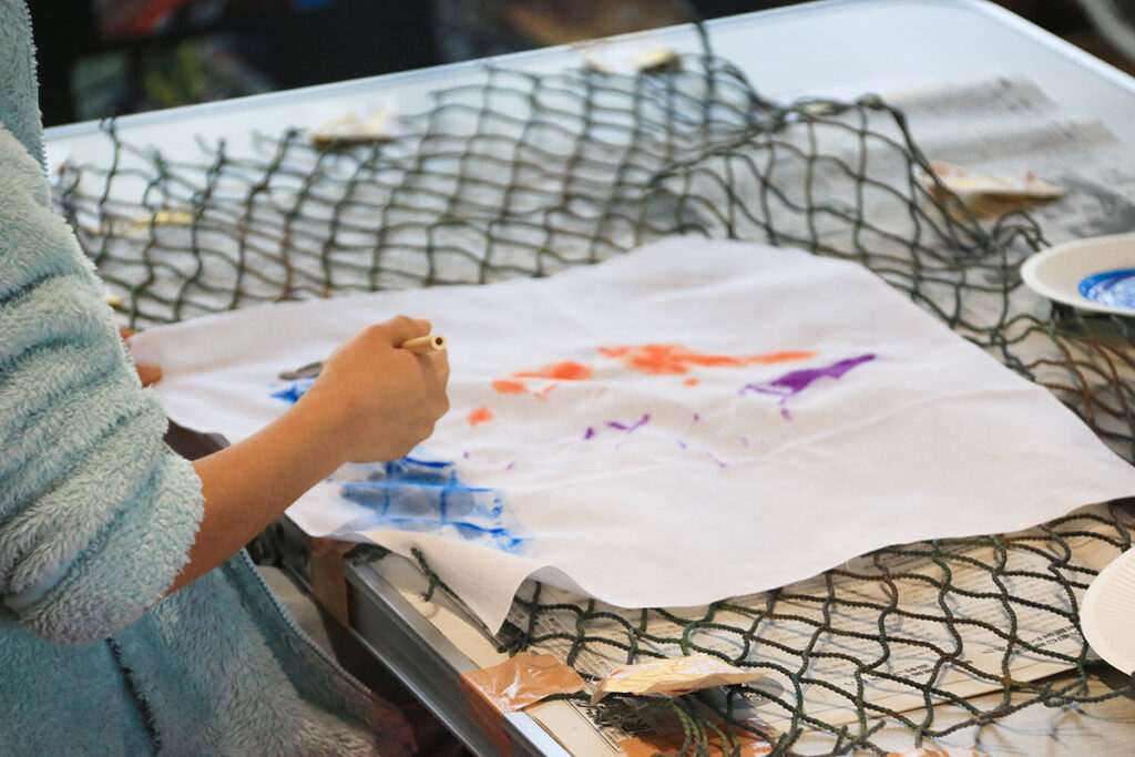 凹凸のある漁網の上に布を置き、絵の具で網の模様を写し取ります。漁網は有明海で実際に使用されていた物を使用。