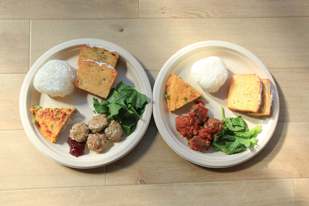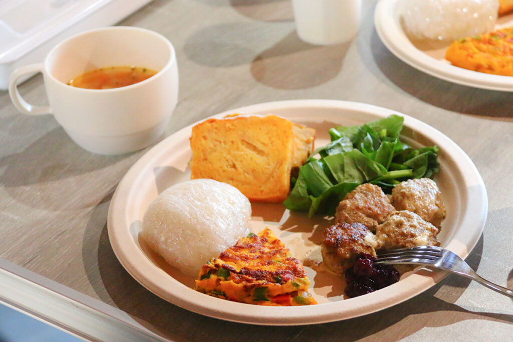 スウェーデンのミートボール、付け合わせにほうれん草サラダ、スペイン風オムレツ、イタリアの具沢山スープ、イギリスのりんごの米粉パウンドケーキ、フランスのさつま芋の米粉ガトーインビジブル