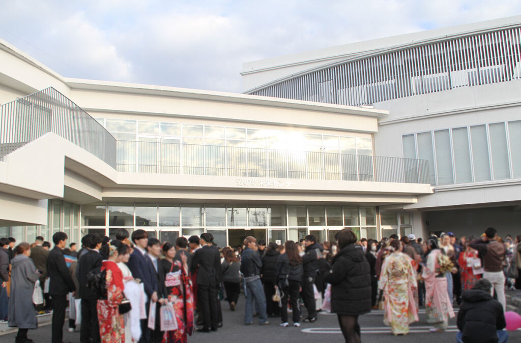 愛野運動公園と会場を結ぶシャトルバスも運行され、13時の受付開始を過ぎると、晴れ着やスーツ姿の参加者が続々と集まりました。再会を喜ぶ声や思い出話に花が咲き、会場は自然と笑顔に包まれていきます。