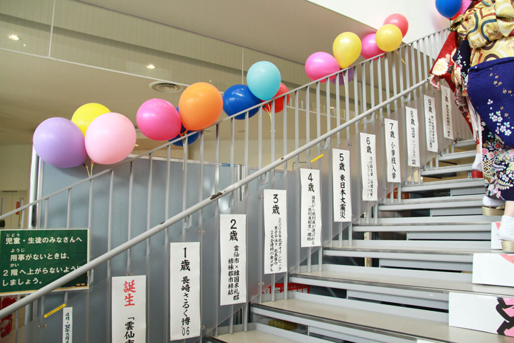 2025年は、雲仙市が市制施行20周年を迎える節目の年。この日参加した二十歳の皆さんと同じ「20年」の歩みが、会場へと続く階段に年表として掲示され、足を止めて見入る姿も見られました。