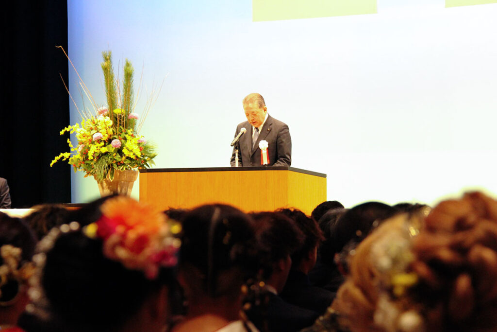 式典では、金澤秀三郎市長や来賓の方々が、二十歳の皆さんに向けてお祝いの言葉を贈りました。