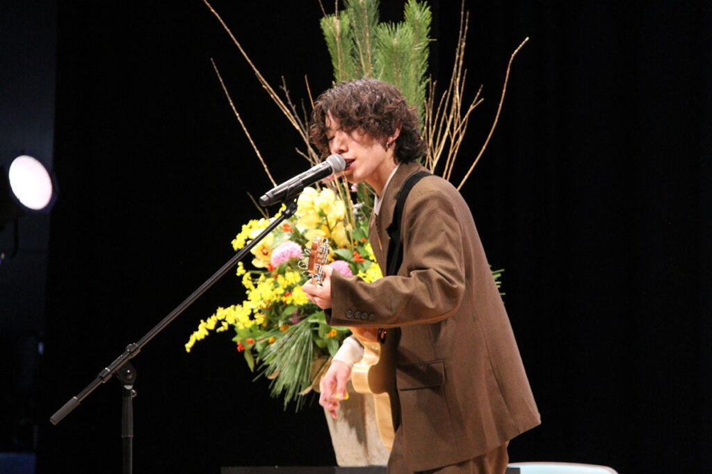 瑞穂町出身の江﨑さんは、「何を重んじ、何を選び抜くのか。それが自分にとっての幸せなのだと思う」と語りかけ、「帰るべき場所がここにあることを忘れないでほしい」と参加者にメッセージを送りました。まだまだ伝えるには青臭い「ありがとう」の重みを感じられる大人になりたいと話し、「自分の好きなこと、やるべきことに向き合い、やったぞと胸を張って言える20代にしたい」と未来への思いを語りました。最後に披露した一曲に、会場から大きな拍手が送られました。