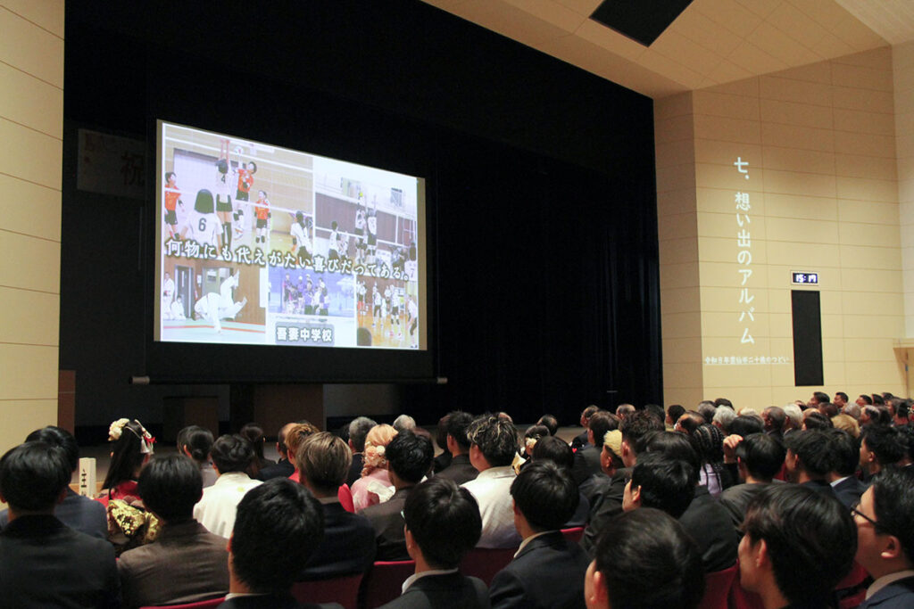 中学校時代の映像に笑い声や歓声があがり、みんなで思い出を楽しむひととき。