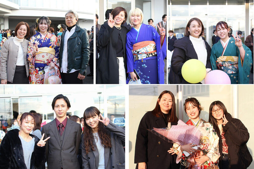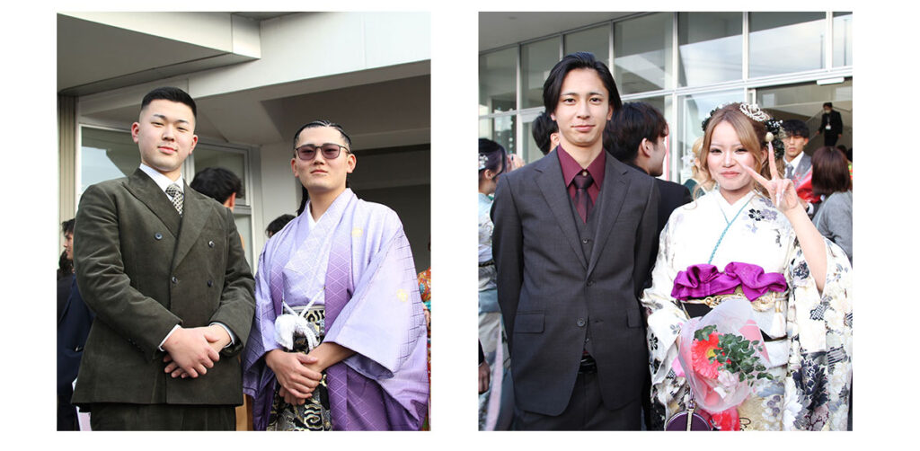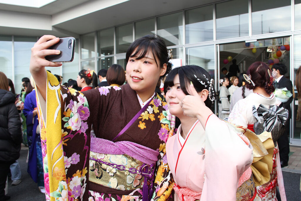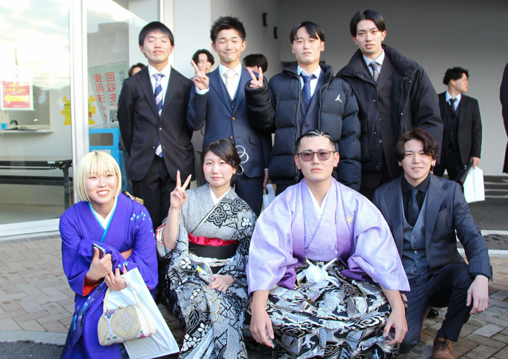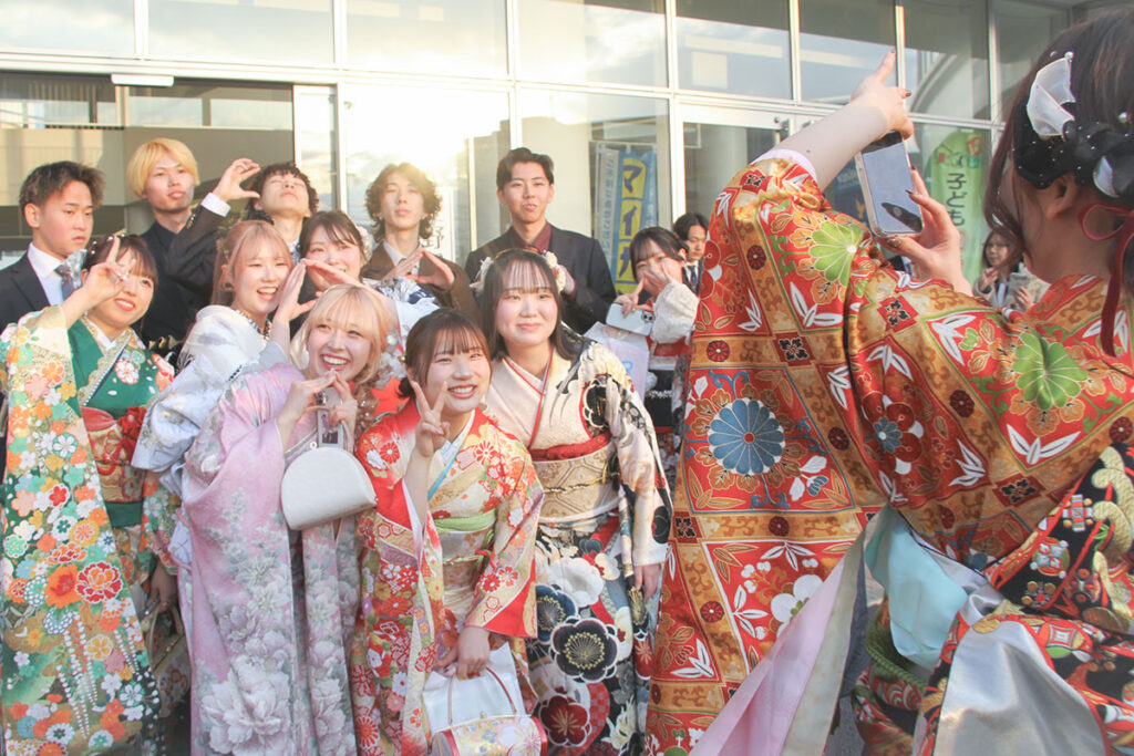 式典のあとも、会場は笑顔とにぎやかさに包まれます。久しぶりに会う仲間と写真に収まる二十歳たち。
