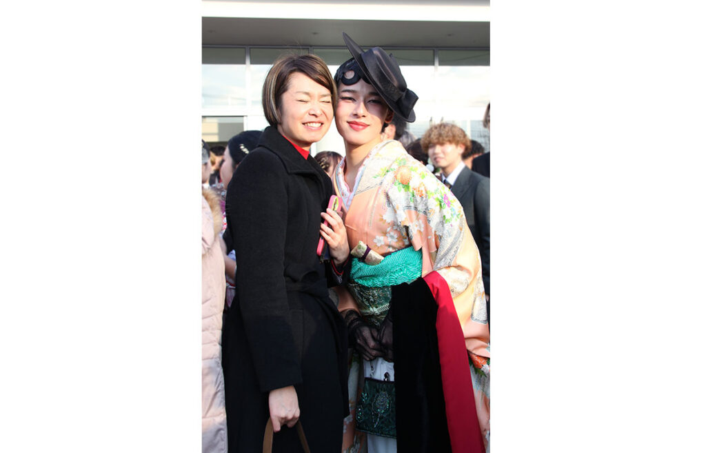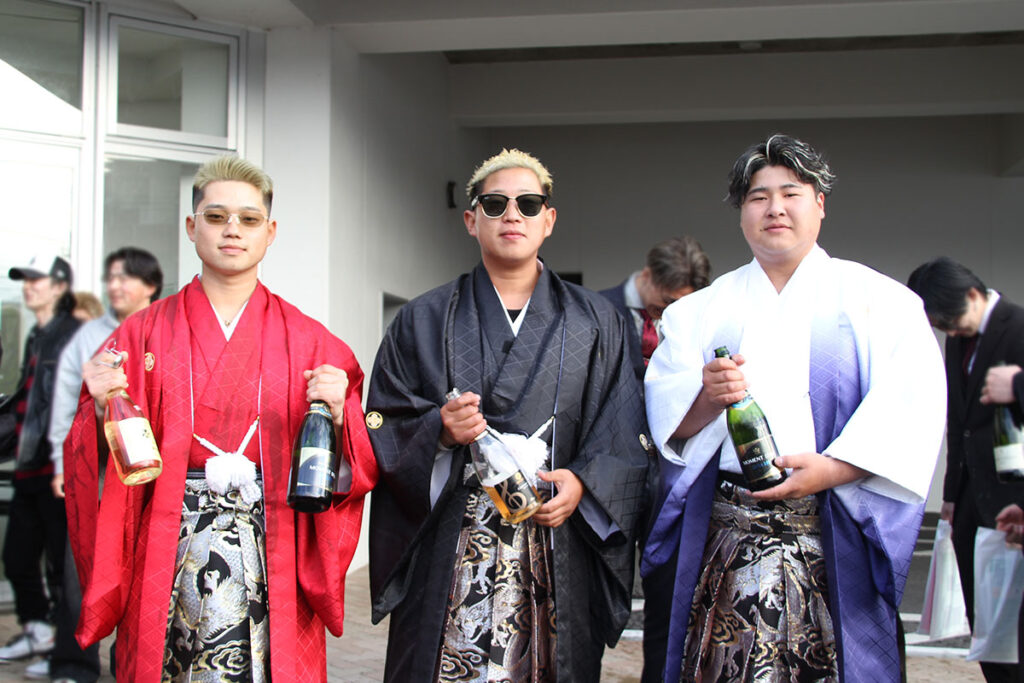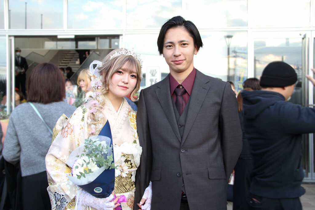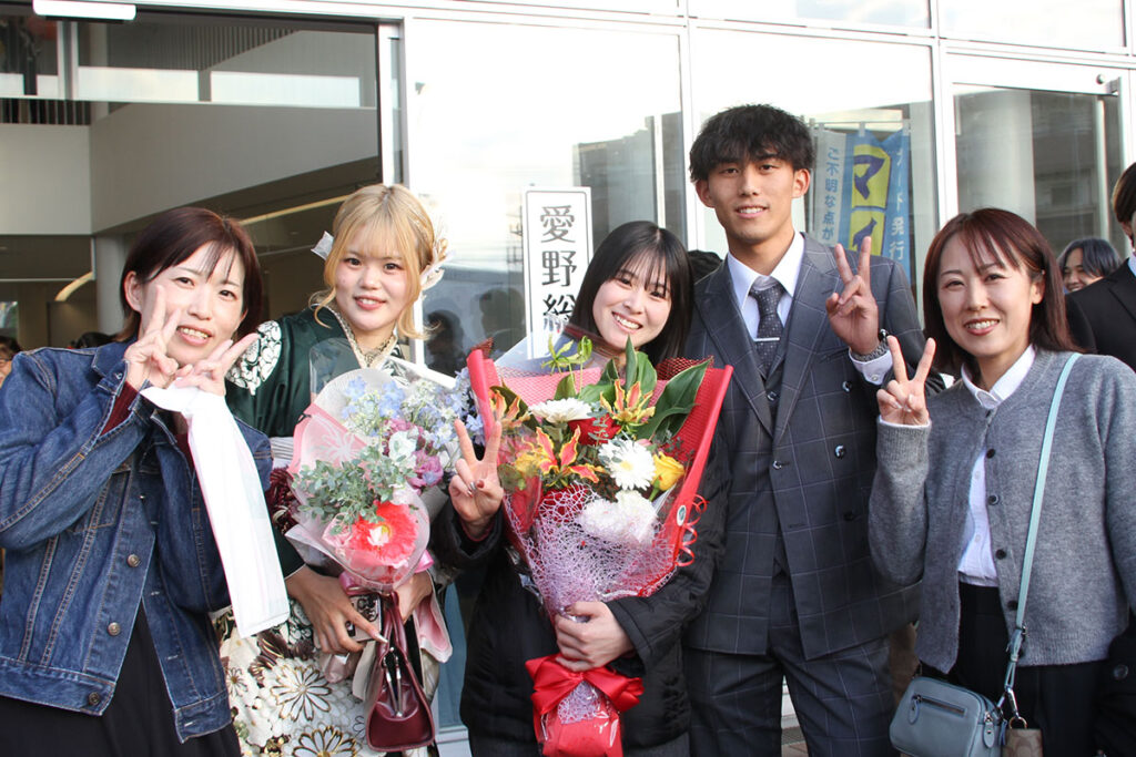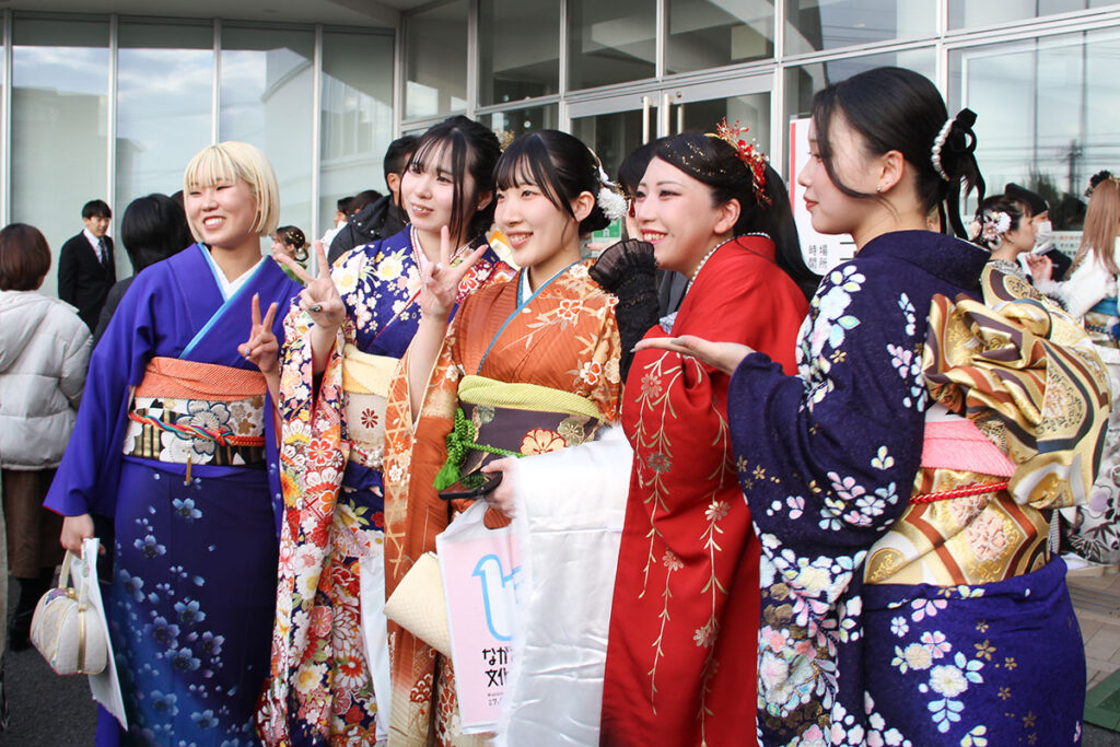式典のあとも、会場は笑顔とにぎやかさに包まれます。久しぶりに会う仲間と写真に収まる二十歳たち。