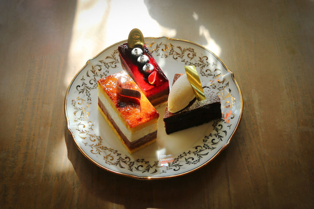 甘酸っぱいカシスムースとチョコレートを重ねた「カシスショコラ」、しっとり濃厚でほろりとほどける「クラシックショコラ」、軽やかな食感の定番「サンマルク」など、素材の個性が際立つ上質なケーキ。
