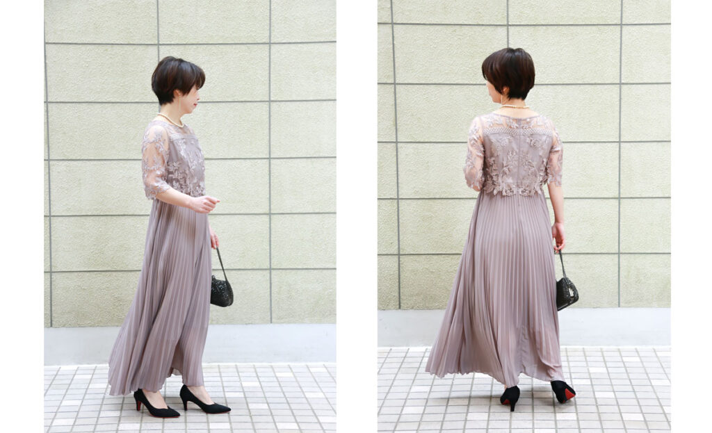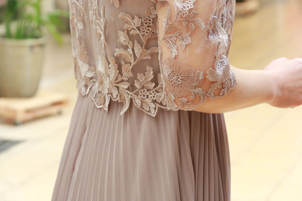 レースとプリーツを組み合わせた上品で華やかなデザイン。上半身には繊細なレースがあしらわれており、女性らしい柔らかさと高級感を演出してくれます。一方で、スカート部分は細かなプリーツになっているため、歩くたびにふんわりと揺れ、軽やかで優雅な印象。
