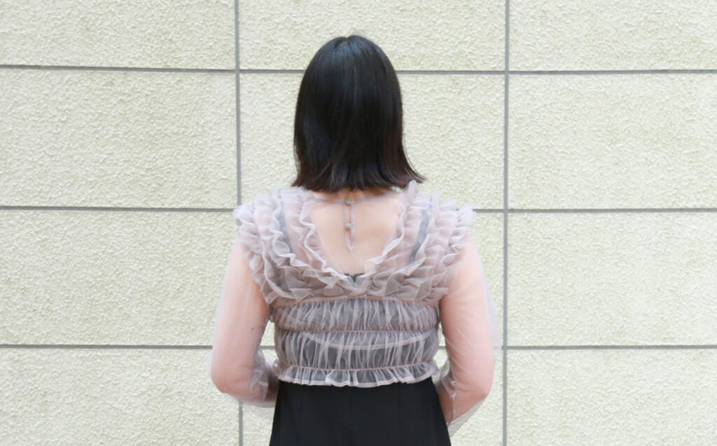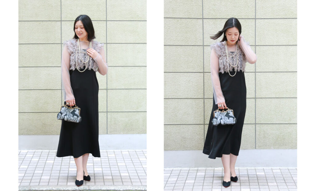 上半身には繊細なシアー素材と立体感のあるフリルがあしらわれ、顔まわりを華やかに見せながら、抜け感のある軽やかな印象をプラスしてくれます。甘さのあるディテールながらも、透け感が上品に抑えられているので、落ち着いた雰囲気で着こなせるのがポイントです♪