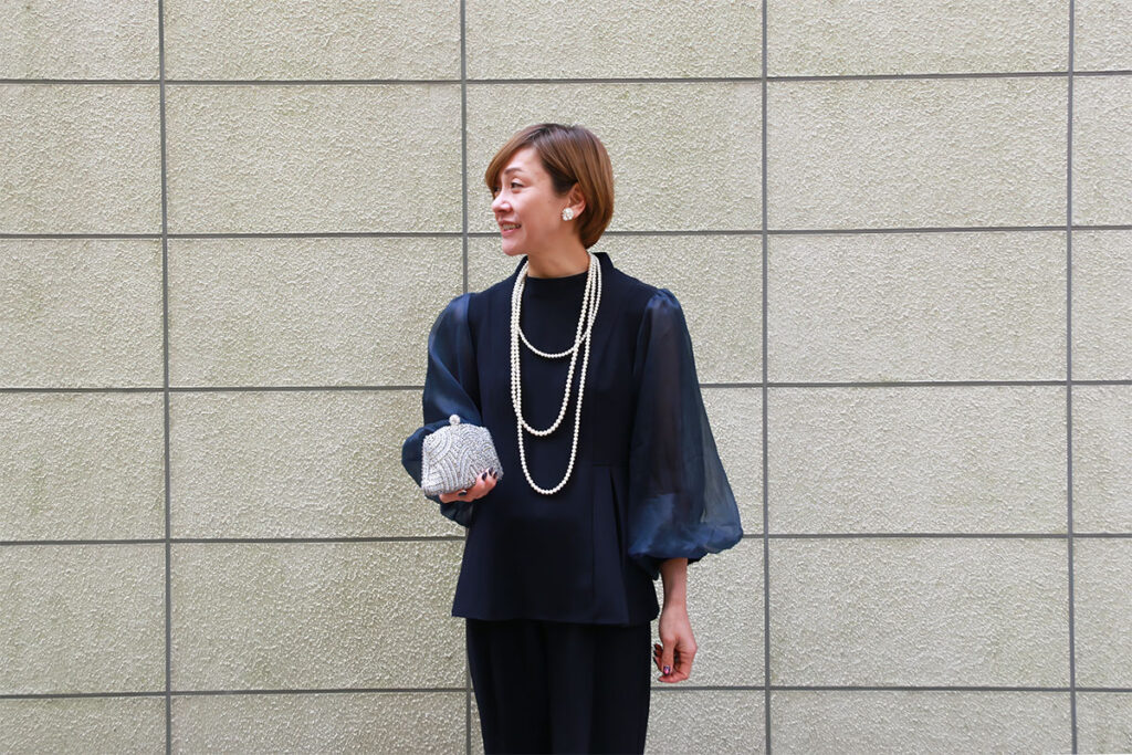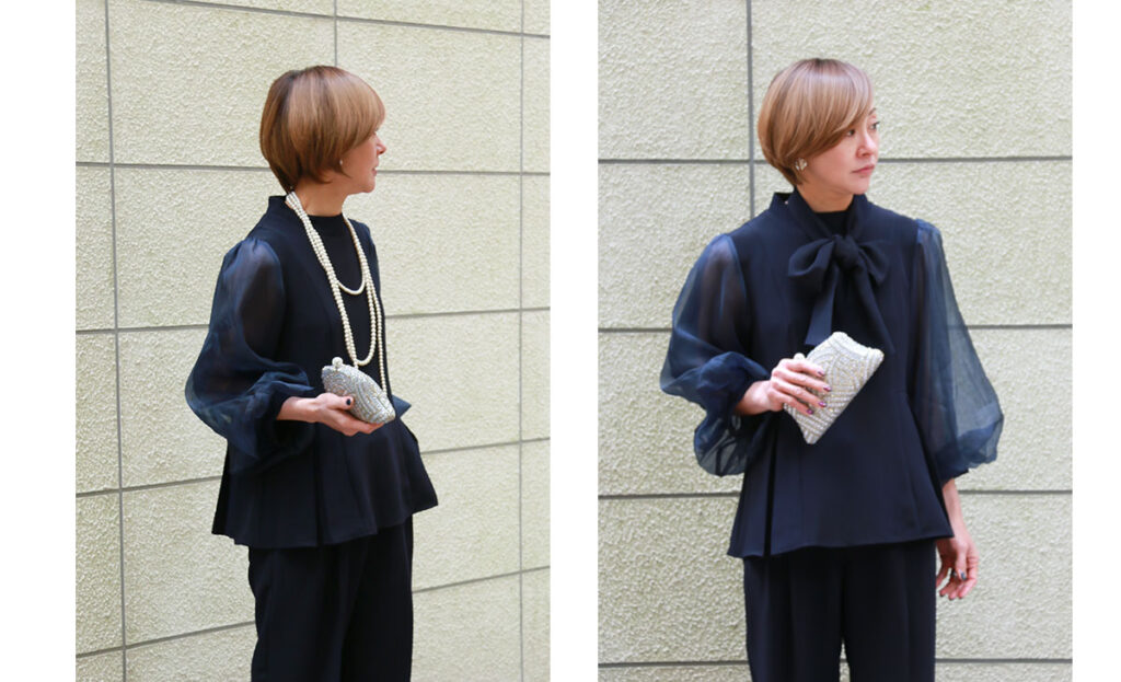 さらに、首元にはリボンが付属しているのも魅力のひとつ。リボンを結べばフェミニンで柔らかな印象に、外せばすっきりと洗練された大人の雰囲気にと、気分やシーンに合わせてスタイルチェンジが楽しめます。パールアクセサリーと組み合わせれば華やかさがぐっとアップし、より特別感のある装いに。