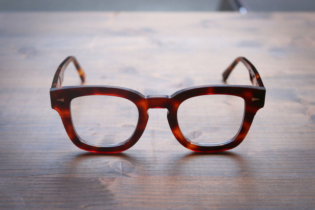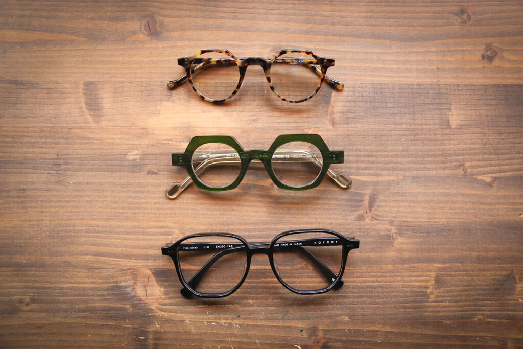 店内に並ぶのは、世界観あふれる個性豊かなフレームたち。クラシカルな魅力が光る「Lesca Lunetier」のクラウンパントシェイプ「HERI」は、黄色味の強い虎べっ甲が印象的。顔なじみが良く、さりげなく個性を演出してくれます。フランス発の「Anne et Valentin」は、かける人の魅力を最大限に引き出すデザインが特徴。シンプルながらも印象に残る一本に出会えます。さらに、80年代をテーマにした「corner」の「Macintoshi」は、ビッグシェイプで存在感抜群。コーディネートの主役になるアイウェアです。