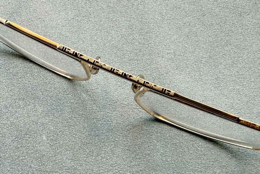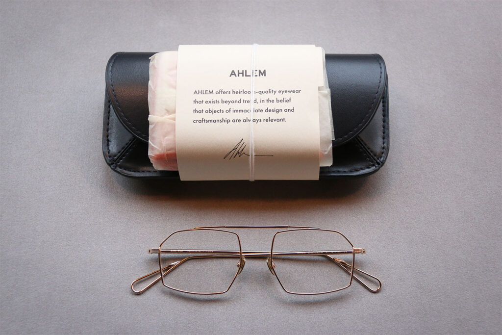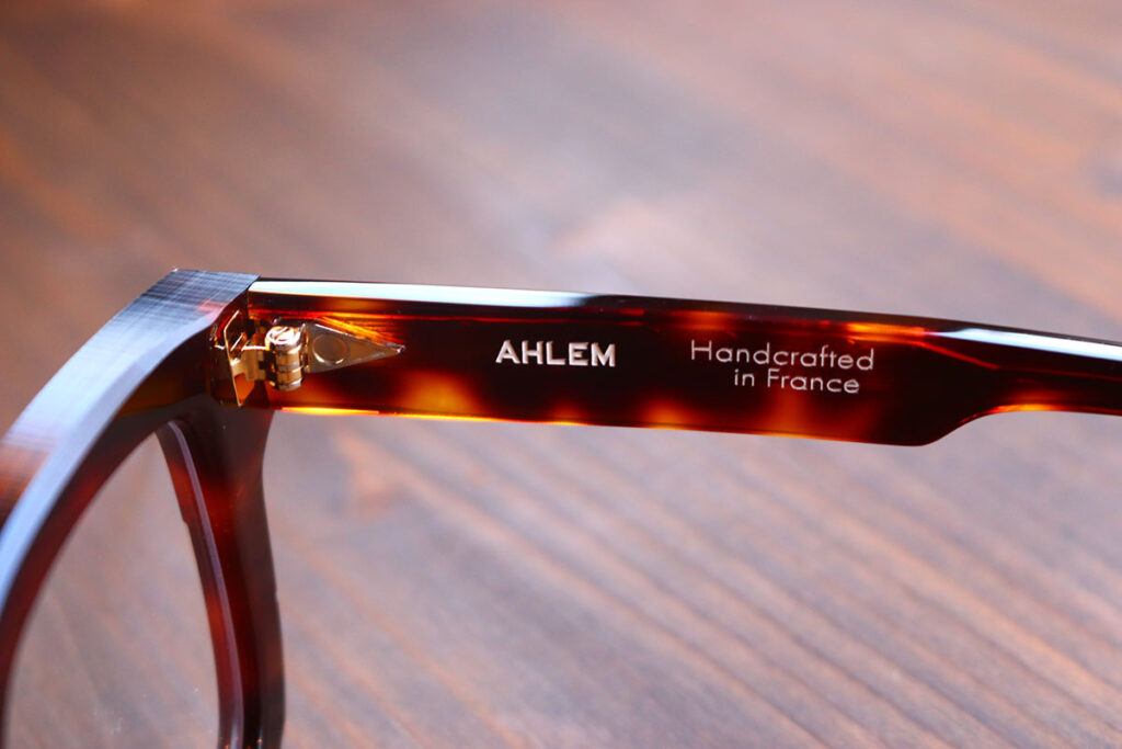 繊細な美しさで注目を集めるのが「AHLEM」。モデル「Royale」は、多角形のゆとりあるシェイプに、リムやテンプルの精巧な彫刻が施された逸品。細部へのこだわりが、かける人の品格を引き立てます。