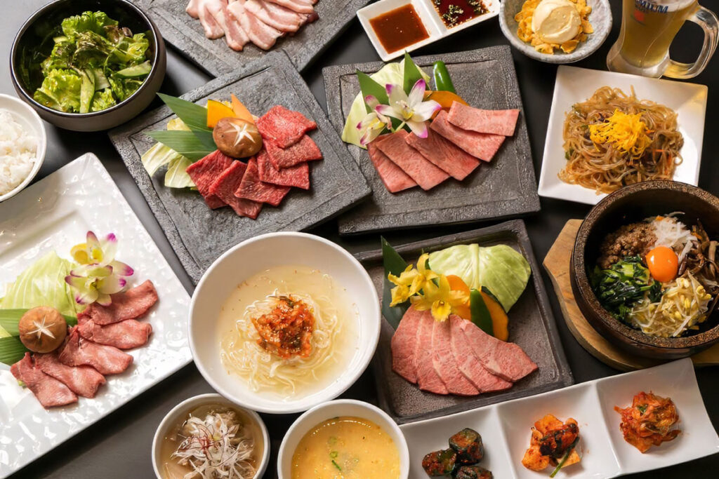 焼肉にとどまらず、特上肉寿司やユッケ、馬刺し、ローストビーフといった一品料理も充実。さらに、自家製チヂミやビビンバ、クッパ、冷麺などの本格韓国メニュー、食後の杏仁豆腐まで揃い、世代を問わず満足できる内容です。盛り合わせや海鮮焼きなど、シェアしながら楽しめるメニューが多いのも嬉しいポイント。